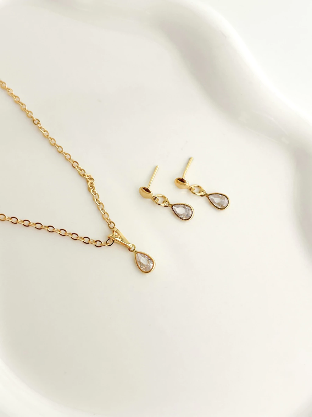 CONJ9477 - CONJUNTO COLAR + BRINCO GOTA CRISTAL - FOLHEADO A OURO